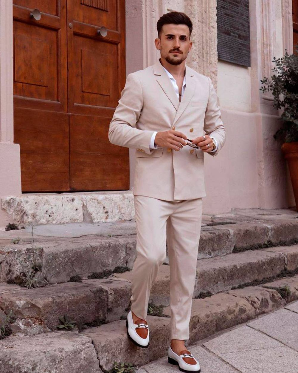 A Beige Wool Blends double breasted rounded lapel Tuxedo Suit Jacket with pocket square will fit you like a globe. Remember, all Hockerty blazers are tailored to your measurements. Get measured at home and we will tailor a personalized jacket from scratch
