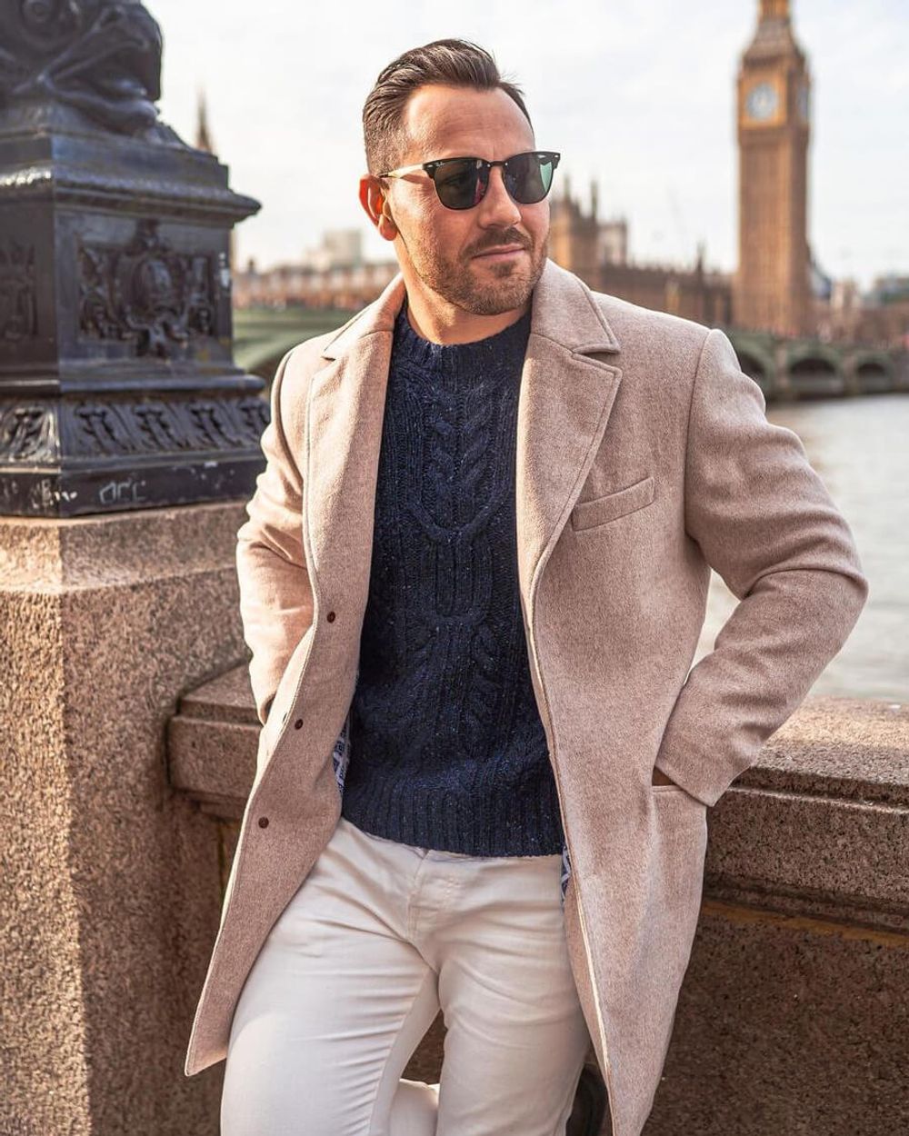 Command the season's style with this exquisite beige melange pea coat featuring wide ulster lapels. Designed for the discerning gentleman who appreciates refined classics with a modern touch, this double-breasted coat offers an impeccable blend of form and function. The sleek, slim-fit silhouette hugs your contours in all the right places, providing a tailored appearance that is both contemporary and timeless.