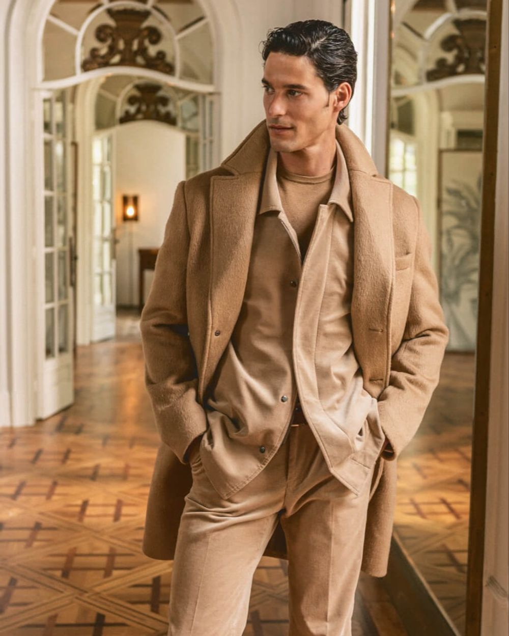 At the back, you'll find a single double-welted pocket, complete with a button closure for added security. This subtle yet practical detail enhances the overall utility of these trousers, ensuring that they remain as functional as they are stylish. The rich dark beige tone of the micro-corduroy weave exudes a refined elegance and the solid texture gives a muted yet sophisticated appearance, making these trousers versatile enough to pair with a variety of tops and jackets.